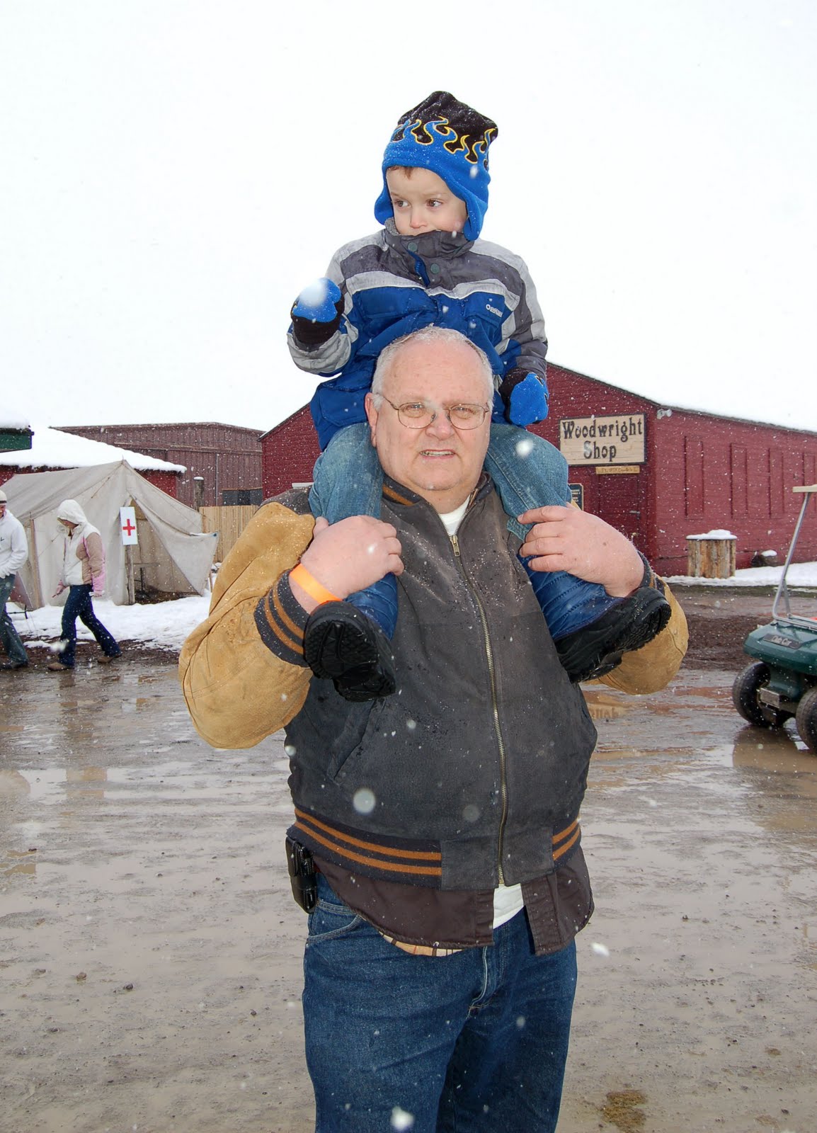 All three days of Baby Animal Days at the Heritage Farm was horrible weather...We kept hoping for a clearing, so we ended up on a Saturday, when it was either "go or forget it" for the year. The snow stopped for a bit, so Papa and I ran and got Hudson. The closer we drove to Wellsville, the harder it snowed. I can live with snow...BUT THE MUD! Oh my, we felt so sorry for young mothers we saw struggling with toddlers in hand, and pushing babies in the strollers which were mired in mud. Because of my small town upbringing with having baby chicks, baby pigs, etc....I want my grandchildren to experience baby animals. I would like to say despite the bad weather it was worth it, but I just can't. It is because of the cost, added to almost an hour and a half wait in line, to seeing baby animals that had all been moved into one barn to keep warm, for TEN MINUTES. No, Mandy was right. It was not worth it, although we did have moments of enjoyment.